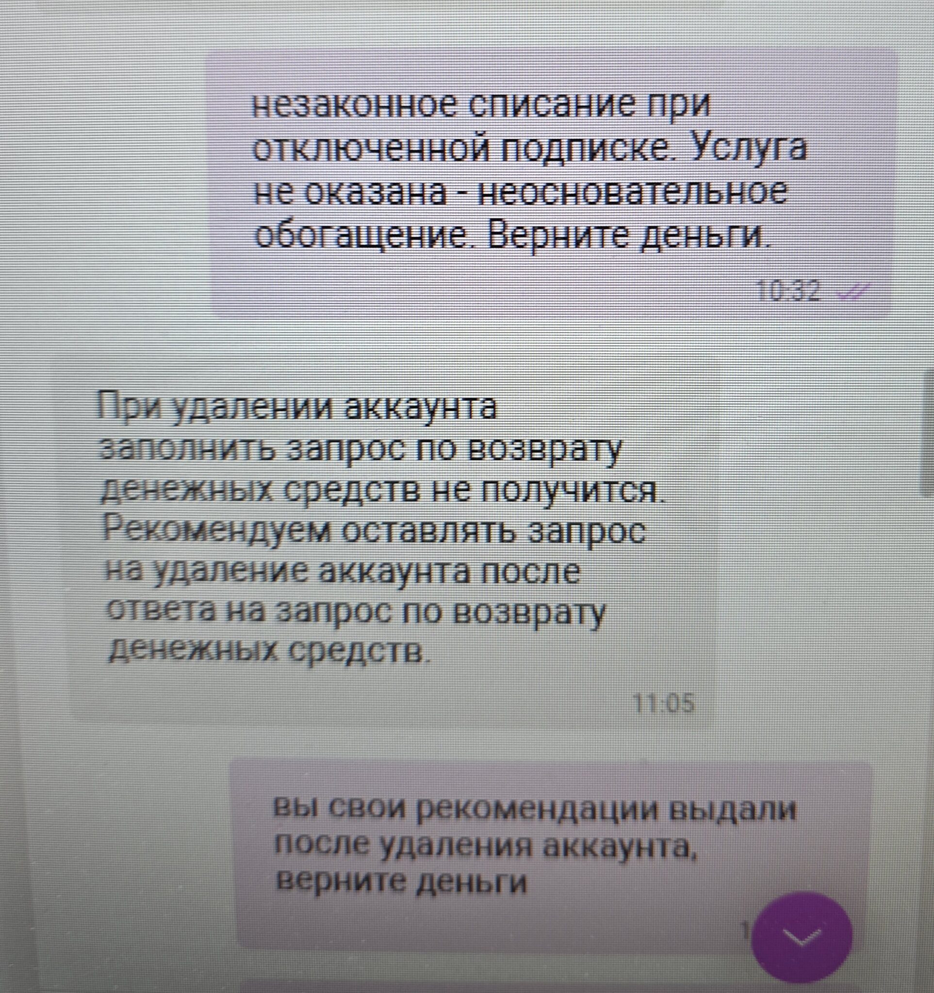 Ладно, подписку эти люди с горем-пополам, с 10 стука в поддержку, отменили. Точнее, они не согласились сделать это сами, естественно! Скинули мне ссылку. Кстати, в их чате переписка не сохраняется. Писать нужно заново, если окно было закрыто на долгое время в личном кабинете, а отвечают долго. В итоге, все их ответы теряются, приходится гуглить и искать почту, чтобы все сохранилось.