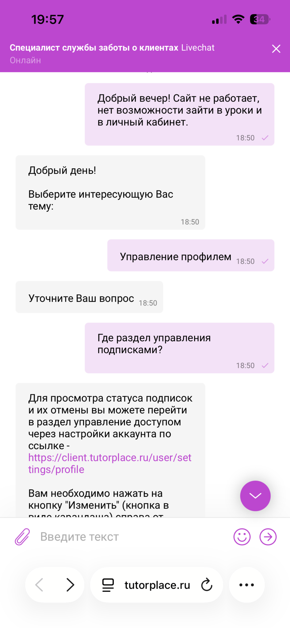 Самый враждебный и неэтичный интерфейс. Подписку невозможно отменить, эти мелкие попрошайки даже 99 руб в месяц будут пытаться постоянно списать. Не пользуюсь их сервисом и отменить подписку не могу. Это осознанная, продуманная до мелочей система по удержанию ваших денег любой ценой. Жаль, что я не знала этого до первой подписки. TutorPlace пытаются просто красть деньги.